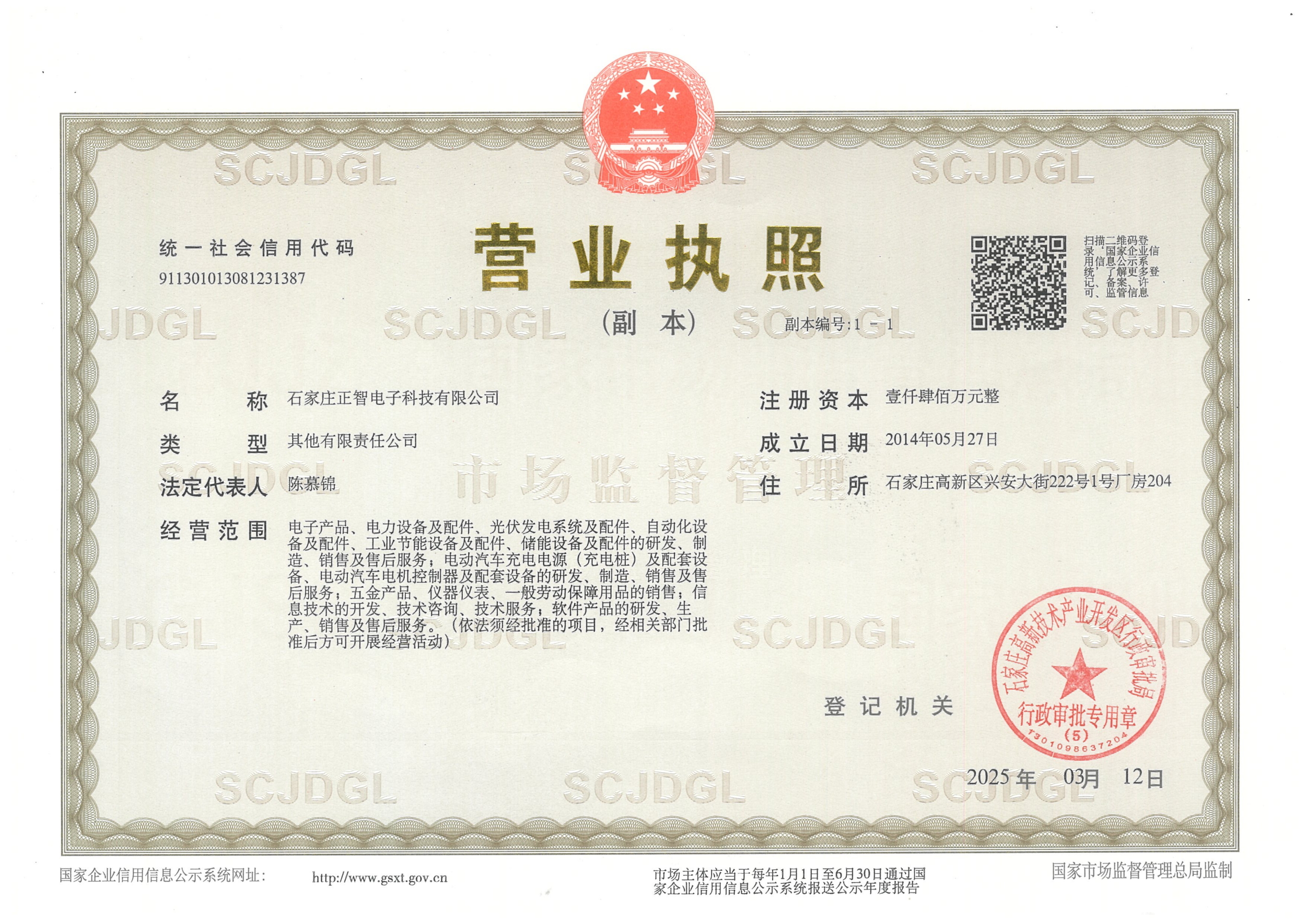 石家庄正智电子科技有限公司(以下简称正智电子)位于中国近代电力电子产业发源地之一的石家庄市,毗邻京津地区,是环渤海经济圈中重要城市之一。 是一家极具发展潜力的知识密集型高新技术企业。正智电子是一家致力于电力电子技术创新、产品创新,以高频开关电源及相关电子产品研发、生产、 销售、 运营和服务于一体,为客户提供系统能源解决方案的高新技术企业。历经多年的快速发展,公司已开发出了多种高新技术产品,涉及新能源汽车 新能源汽车车载充电、电力、高速列车、冶金、军事工业、船舶、广播电视、应急电源等多个领域,销售网络遍及全国20多个省市自治区,产品远销海 外。领先的技术优势、可靠的质量保证和卓越的服务品质赢得了国内外客户的一致好评。近几年,公司的产品在电力等传统领域继续保持良好的发展势 头,市场占有率快速提高。